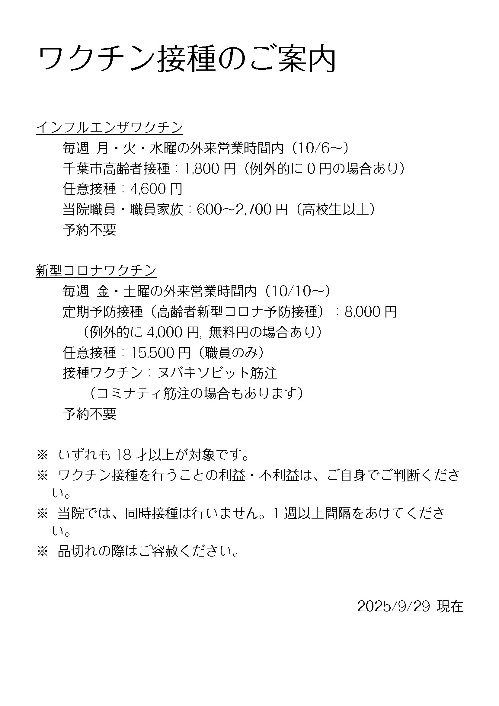 発熱(37.0℃以上)・倦怠感・喉の痛み・呼吸器症状(咳・呼吸や胸が苦しい)・味覚嗅覚障害(味や匂いがわかりにくい)・消化器症状(吐き気・嘔吐・下痢等)・全身の関節痛や筋肉痛・その他の風邪症状のある方は、「受診前に」当院に電話をして下さい。