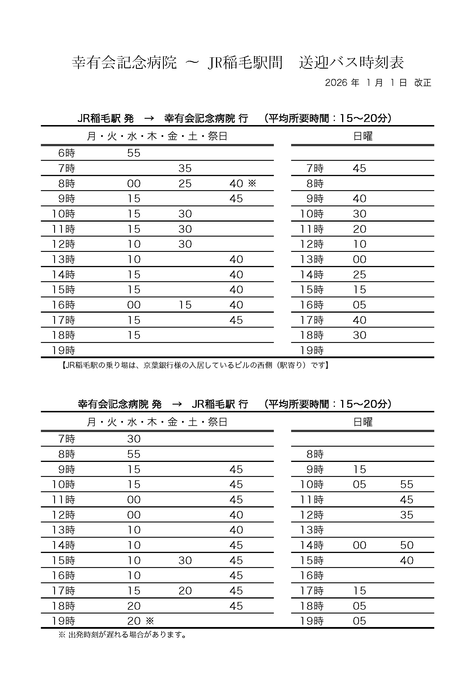 1/1ダイヤ改正(平日朝7時台・ JR稲毛駅→病院)